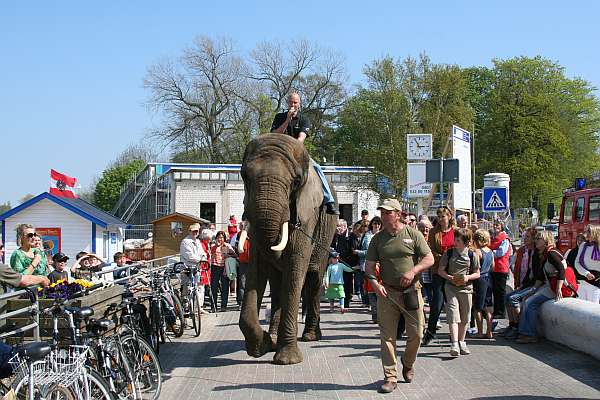 Eventmanager René Kleinschmidt auf der Elefantendame "Mala" beim "Anbaden" am 03. Mai 2008 in Niendorf/Ostsee